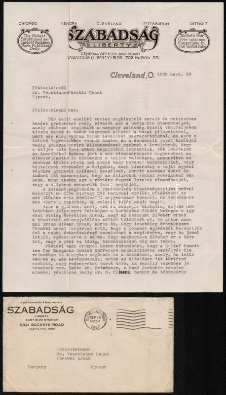 1920 Venetianer Lajos főrabbinak címzett levél Clevelandből, a Szabadság c. amerikai magyar lap szerkesztőségéből, érdekes szöveggel a magyarországi zsidóság helyzetéről.