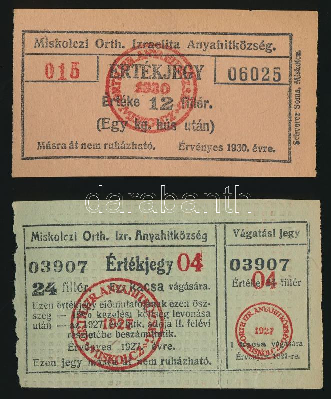 1927-1930 A Miskolci Orthodox Izraelita Anyahitközség 2 db értékjegye... https://www.darabanth.com/hu/287-Gyorsarveres/287.0/Festmeny-mutargy-papirregiseg-egyeb/Judaika~100023/1927-1930-A-Miskolci-Orthodox-Izraelita-Anyahitkozseg-2-db-ertekjegye-kacsa-vagatasi-jegy-h~II1506462
