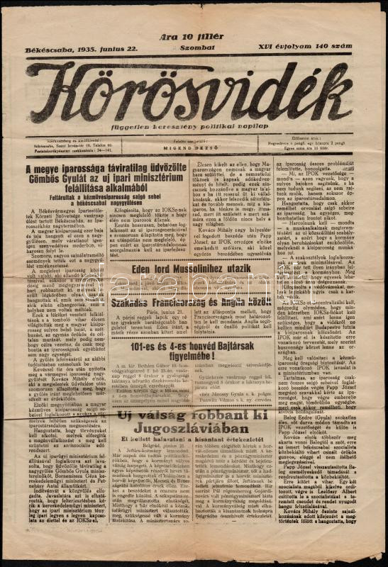Leírás: 1935 Békéscsaba, Körösvidék független keresztény politikai napilap XVI. évfolyam 140. szám