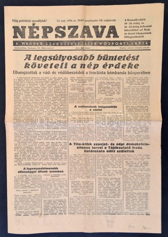 Leírás: 1949 A Népszava 77. évfolyamának 220. száma, címlapon a Rajk-perről szóló cikkel