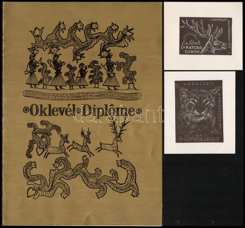 Leírás: 1971 Budapesti Vadászati Világkiállítás kitöltetlen oklevél + a kiállítás színes térképe + kiállítás kapcsán készült ex libris