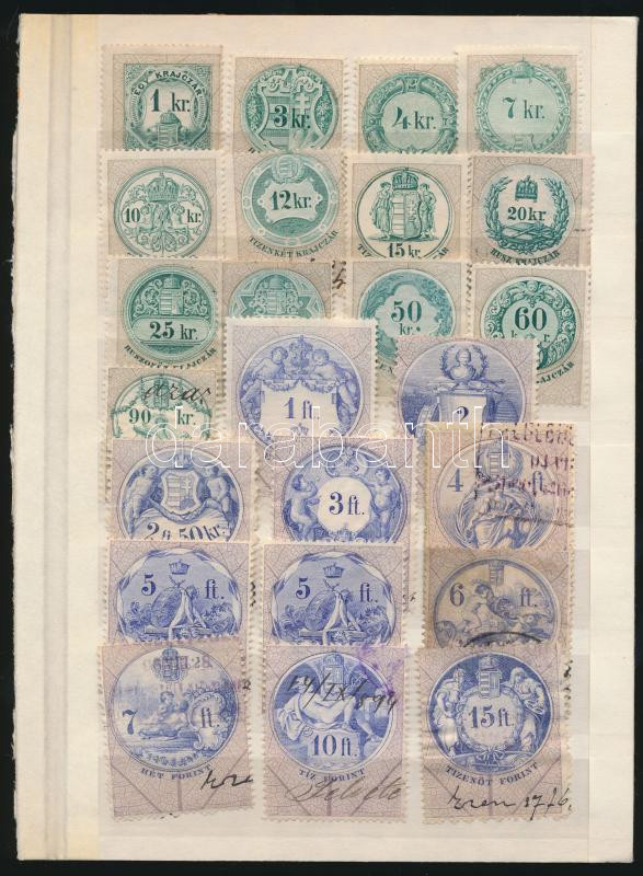 Leírás: 1891 24 db okmánybélyeg nagyobb értékekkel