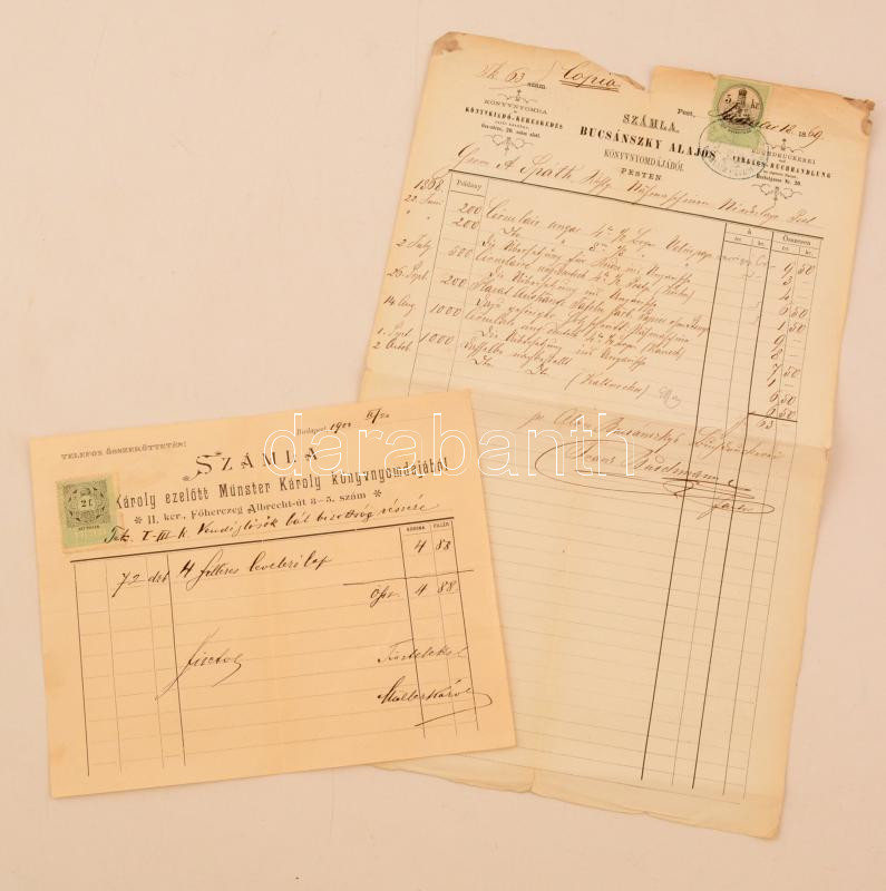 Leírás: 1869, 1900 Pest, Budapest, Bucsánszky Alajos és Münster Károly könyvnyomdájának fejléces számlája 2f és 5kr okmánybélyeggel