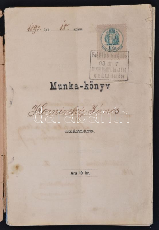 1893 Munka-könyv bányamunkás részére, Szélaknai (Selmecbánya) bányahivatal, bejegyzésekkel, a mátraszelei és mizserfa bányagondnokság pecséteivel, szolgálati és munkarend szabályzat, és bányapénztári alapszabályzattal, kissé viseltes állapotban, 15+16+2+III+35 p.