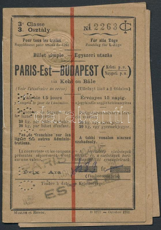 1933 Párizs-Budapest vasúti jegy füzet, 3. osztály, néhány lap kiszaka... https://www.darabanth.com/hu/287-Gyorsarveres/287.0/Festmeny-mutargy-papirregiseg-egyeb/Okmanyok~100016/1933-Parizs-Budapest-vasuti-jegy-fuzet-3-osztaly-nehany-lap-kiszakadt~II1506521