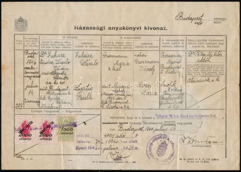 1946 Házassági kivonat inflációs díjlerovással https://www.darabanth.com/hu/287-Gyorsarveres/287.0/Festmeny-mutargy-papirregiseg-egyeb/Okmanyok~100016/1946-Hazassagi-kivonat-inflacios-dijlerovassal~II1509017