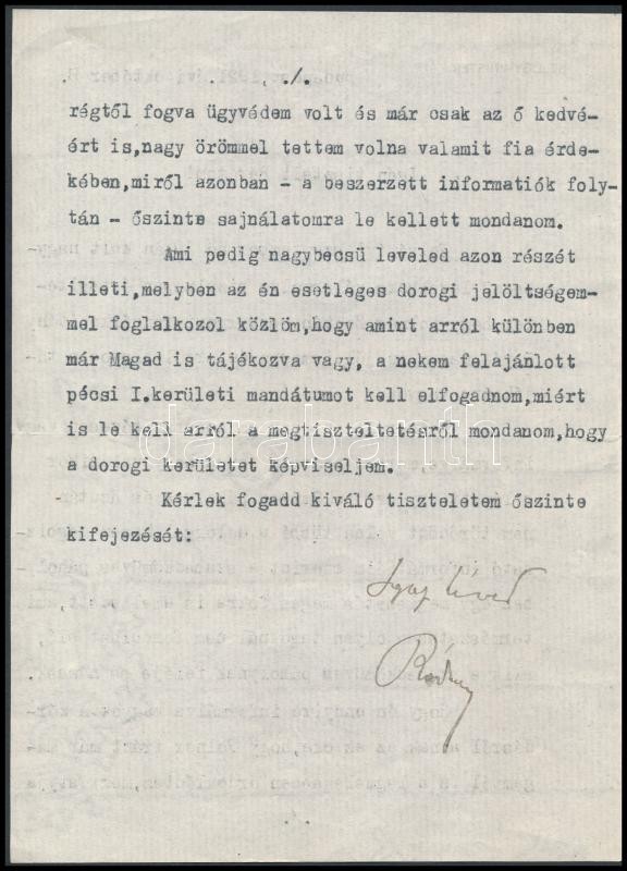 1921 Ráday Gedeon (1872-1937) belügyminiszter (1921) levele Palkovics László (1877-1933) Esztergom vármegye alispánja részére Polner Zoltán (?-?) esztergomi rendőrkapitány szabadkőműves tevékenysége ügyében, Ráday aláírásával, 4 p