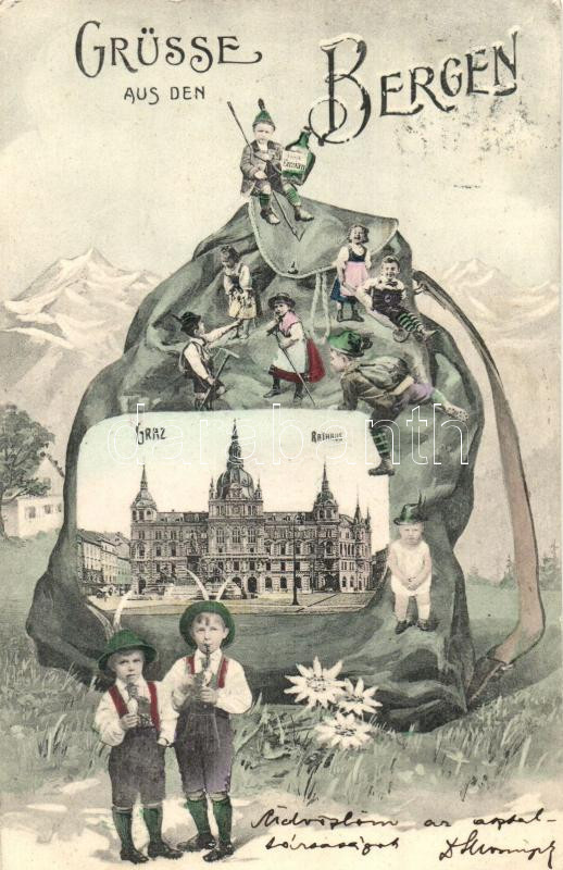 Graz, Rathaus; Grüsse aus den Bergen... / town hall, children greeting... https://www.darabanth.com/hu/287-Gyorsarveres/287.0/Kepeslapok/Ausztria~200015/Graz-Rathaus-Grusse-aus-den-Bergen-town-hall-children-greeting-card-Franz-Knollmuller-No~II1505983