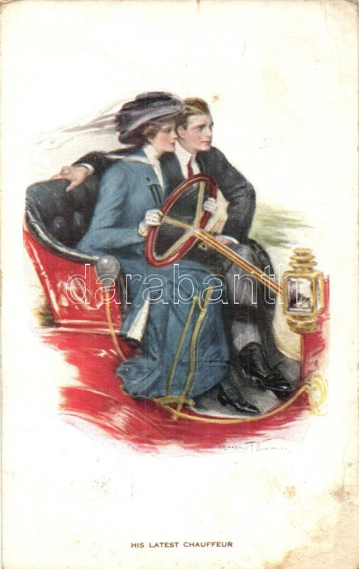 Leírás: 'His latest chauffeur' couple in automobile, Taylor Platt & Co. Series 782. s: Clarence F. Underwood (EB)