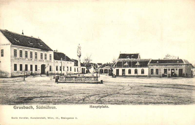 Leírás: Hrusovany nad Jevisovkou, Grusbach; Hauptplatz, Gasthof zum weissen Kreuz, Verlag Franz Schreiber / Main square, guest house (EK)