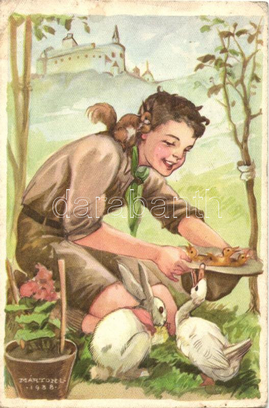 Leírás: "A cserkész szereti a természetet, jó az állatokhoz..." Cserkész Levelezőlapok Kiadóhivatal / scout boy s: Márton L. (EK)