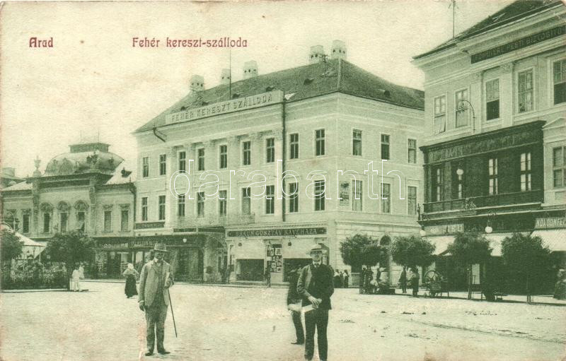 Arad, Fehér Kereszt szálloda, Braun Gusztáv kávéháza, Husserl M., Ifj. Klein Mór üzlete és saját kiadása / hotel, café, shops (kis szakadás / small tear)