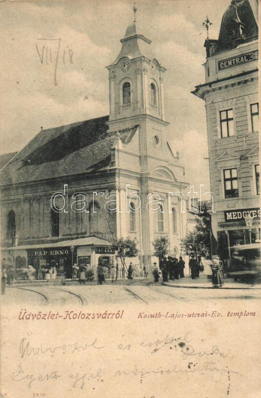 Kolozsvár, Kossuth Lajos utca, Evangélikus templom, Központi szálloda,... https://www.darabanth.com/hu/287-Gyorsarveres/287.0/Kepeslapok/Erdely~200006/Kolozsvar-Kossuth-Lajos-utca-Evangelikus-templom-Kozponti-szalloda-Pap-Erno-es-Medgyesy-u~II1202914