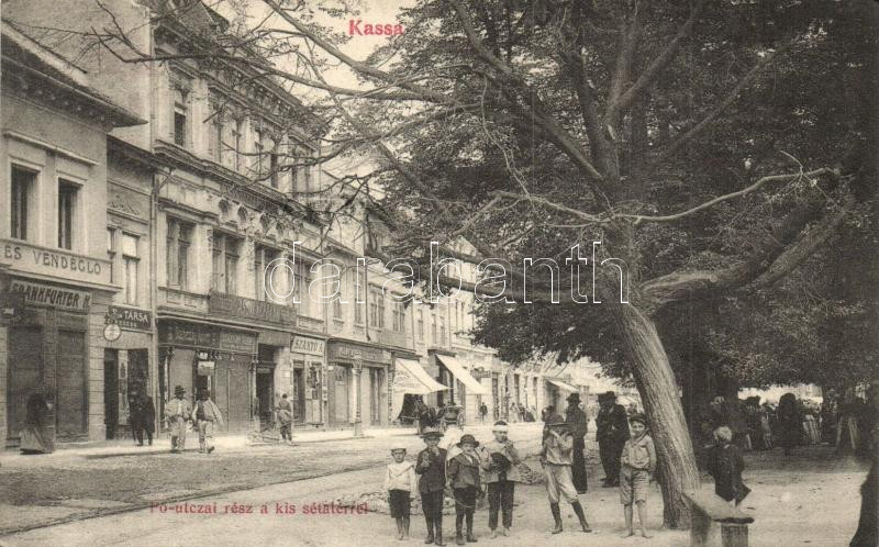Leírás: Kassa, Kosice; Fő utca, Kis sétatér, vendéglő, Frankfurter M. és Szántó A. üzlete / main street, promenade, shops