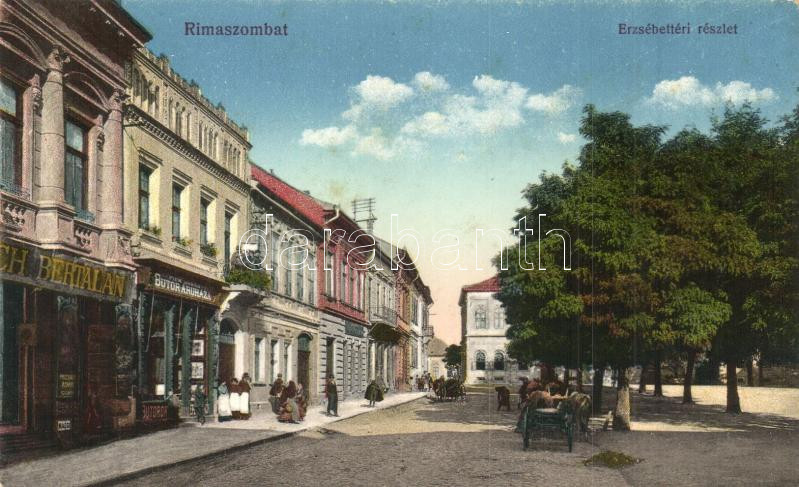 Rimaszombat, Rimavska Sobota; Erzsébet tér, Heksch Bertalan üzlete, Pick Jakab bútoráruháza, Ifj. Rábely Miklós kiadása / square, shops, furniture store