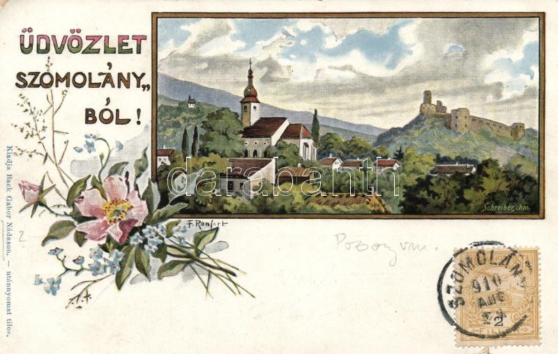 Leírás: Szomolány, Smolenice; templom, Beck Gábor kiadása / church, floral TCV card s: F. Ronfort (b)