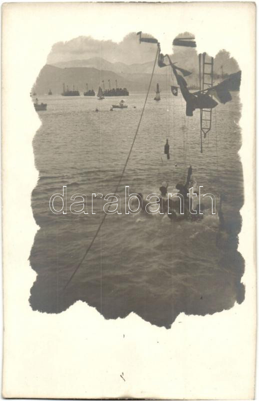 1915 Osztrák-magyar matrózok mulatságos versenye, alkoholos italok az SMS Zara Osztrák-Magyar Monarchia Zara-osztályú torpedóhajójának (őrhajó) spárgájára kötve, aki eléri valamelyik üveget azé az ital jutalmul. / K.u.K. Kriegsmarine, funny competition of SMS Zara in the sea, catch the bottles, photo