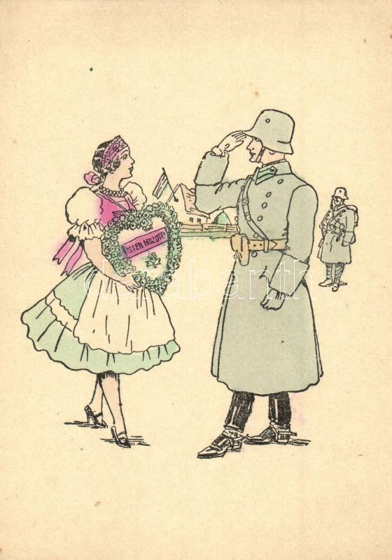 Leírás: Magyar katona bevonuláskor, Délvidéki Egyetemi és Főiskolai Hallgatók Egyesülete kiadása / Entry of the Hungarian troops, folklore