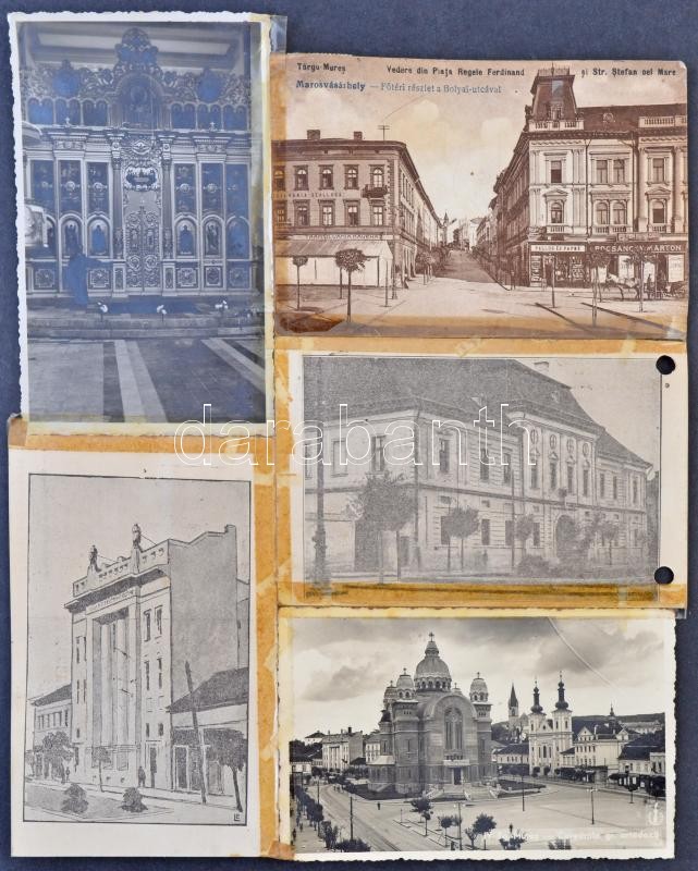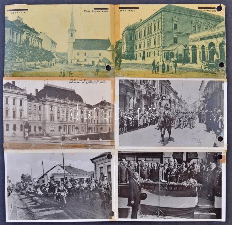28 db RÉGI történelmi magyar városképes lap egyberagasztva, bevonulásos lapok "vissza" pecsétekkel / 28 pre-1945 Historical Hungarian town-view postcards glued together, entry of the Hungarian troops, all with So. Stpl.