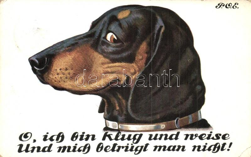 Dachshund, Nr. 4401. s: P.O.E. https://www.darabanth.com/hu/287-Gyorsarveres/287.0/Kepeslapok/Kutya~200065/Dachshund-Nr-4401-s-POE~II1501928