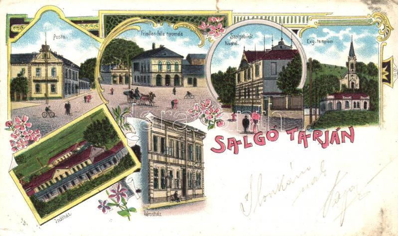 Leírás: 1899 Salgótarján, Friedler féle nyomda, Szolgabírói hivatal, posta, vasútállomás, városháza, floral, Art Nouveau litho (b)
