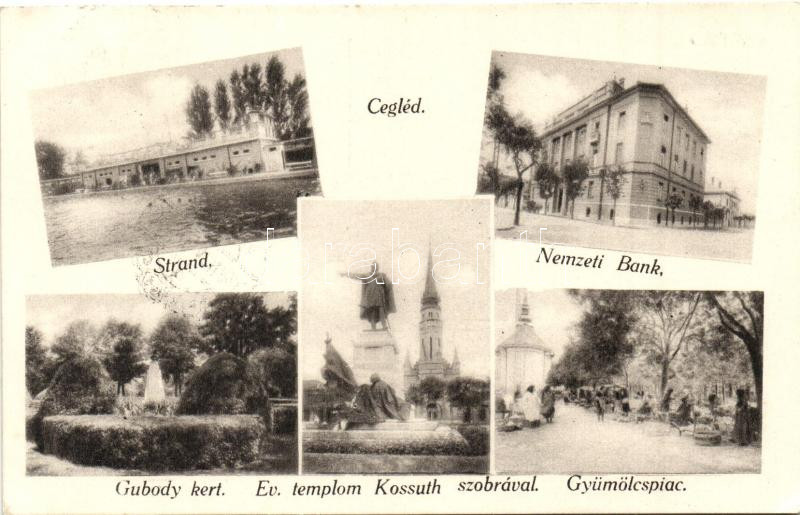 Cegléd, Strand, Nemzeti Bank, Gubody kert, Evangélikus templom, Kossut... https://www.darabanth.com/hu/287-Gyorsarveres/287.0/Kepeslapok/Magyarorszag~200005/Cegled-Strand-Nemzeti-Bank-Gubody-kert-Evangelikus-templom-Kossuth-szobor-Gyumolcspiac-Mi~II1509073