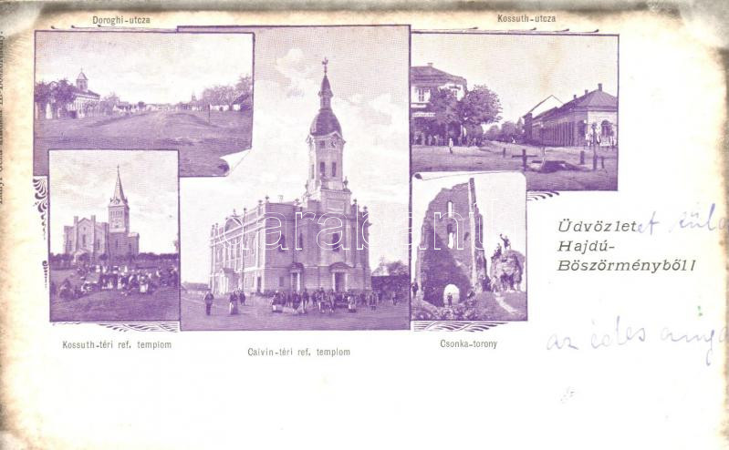Leírás: Hajdúböszörmény, Doroghi és Kossuth utca, Csonka torony, református templomok. Lányi Géza kiadása (EM)