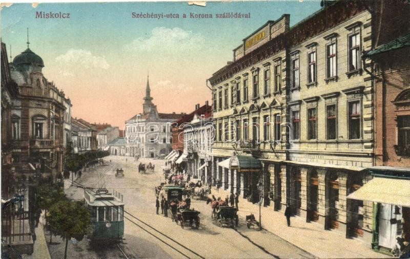 Miskolc, Széchényi utca, Korona szálloda, villamos (b) https://www.darabanth.com/hu/287-Gyorsarveres/287.0/Kepeslapok/Magyarorszag~200005/Miskolc-Szechenyi-utca-Korona-szalloda-villamos-b~II1509185