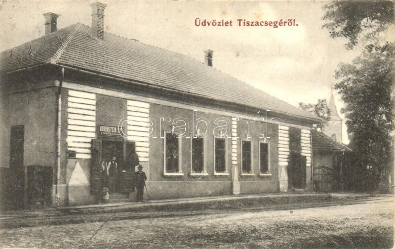 Leírás: Tiszacsege, utcakép Rubinstein S. és társa férfi szabók üzletével, Vámoser Ödön fényképész kiadása (EK)
