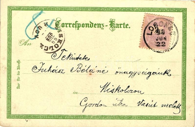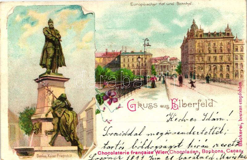 Leírás: 1899 Elberfeld, Europaischer Hof und Bahnhof, Denkmal Kaiser Friedrich III / railway station, floral litho