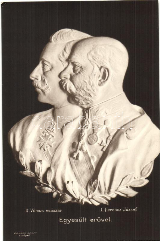 Egyesült erővel; II. Vilmos császár, I. Ferenc József / Viribus Unitis... https://www.darabanth.com/hu/287-Gyorsarveres/287.0/Kepeslapok/Propaganda-politika~200069/Egyesult-erovel-II-Vilmos-csaszar-I-Ferenc-Jozsef-Viribus-Unitis-propaganda-card-Wilhel~II1440155