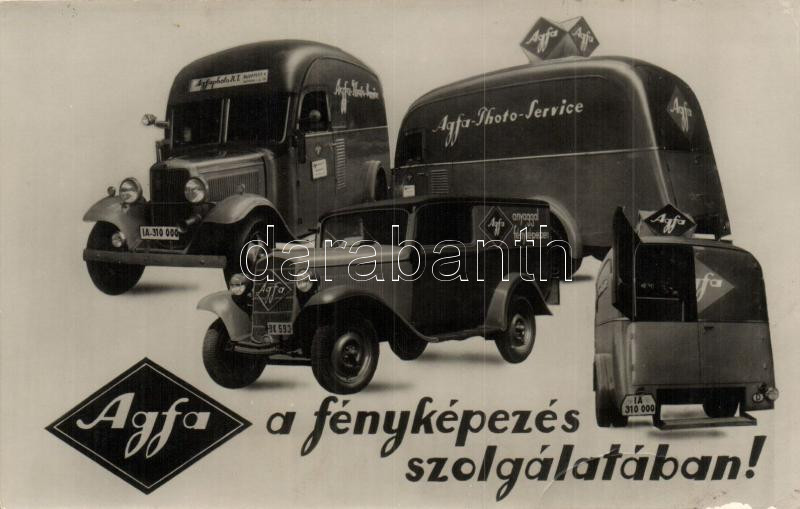 Leírás: Agfa a fényképezés szolgálatában / Agfa-Photo-Service; Hungarian photography service advertisement, automobiles (EB)