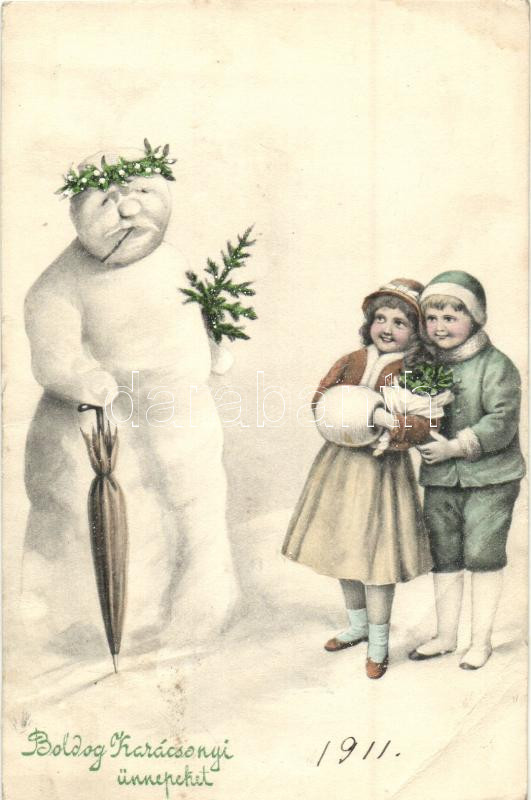 'Boldog Karácsony Ünnepeket' / Christmas greeting card, snow... https://www.darabanth.com/hu/287-Gyorsarveres/287.0/Kepeslapok/Udvozlolapok-Unnepek~200077/Boldog-Karacsony-Unnepeket-Christmas-greeting-card-snowman-with-an-umbrella-and-children-V-~II1501774