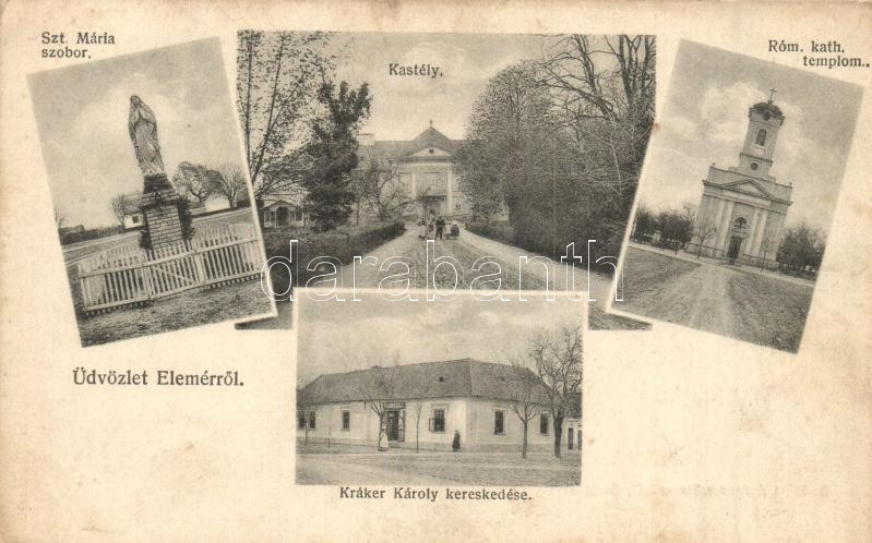 Leírás: Elemér, Német-Elemér, Elemir; Szent Mária szobor, Kiss kastély, Római katolikus templom, Kráker Károly kereskedése / statue, castle, church, shop (fl)