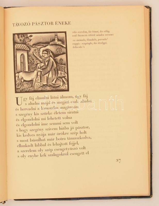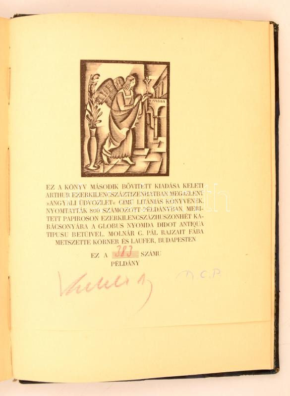 Keleti Arthur: Angyali üdvözlet. Molnár C. Pál Fába metszett rajzaival. Budapest, 1928, Amicus Kiadás. 800 számozott példányból a 383. számozott, és aláírt példány. Kissé sérült félbőr kötésben, 78 p.