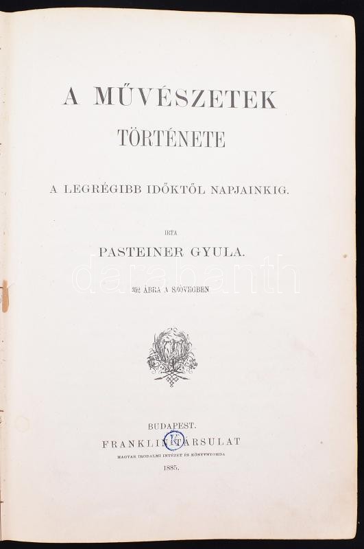 Pasteiner Gyula: A művészetek története. A legrégibb időktől napjainkig. 352 ábra a szövegben. Bp., 1885, Franklin-Társulat. Korabeli kopottas félvászonkötésben.