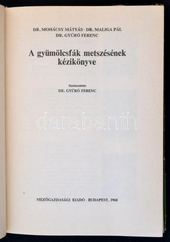 Dr. Mohácsy Mátyás, Dr. Maliga Pál, Dr. Gyúró Ferenc: A gyümölcsfák metszésének kézikönyve. Szerk.: Dr. Gyúró Ferenc. Budapest, 1968, MezÅ‘gazdasági Kiadó. Kiadói egészvászon kötés, kiadói szakadozott papÃr védÅ‘borÃtóban, fekete-fehér fotókkal, ábrákkal illusztrálva, egy helyen tollal aláÃrás.