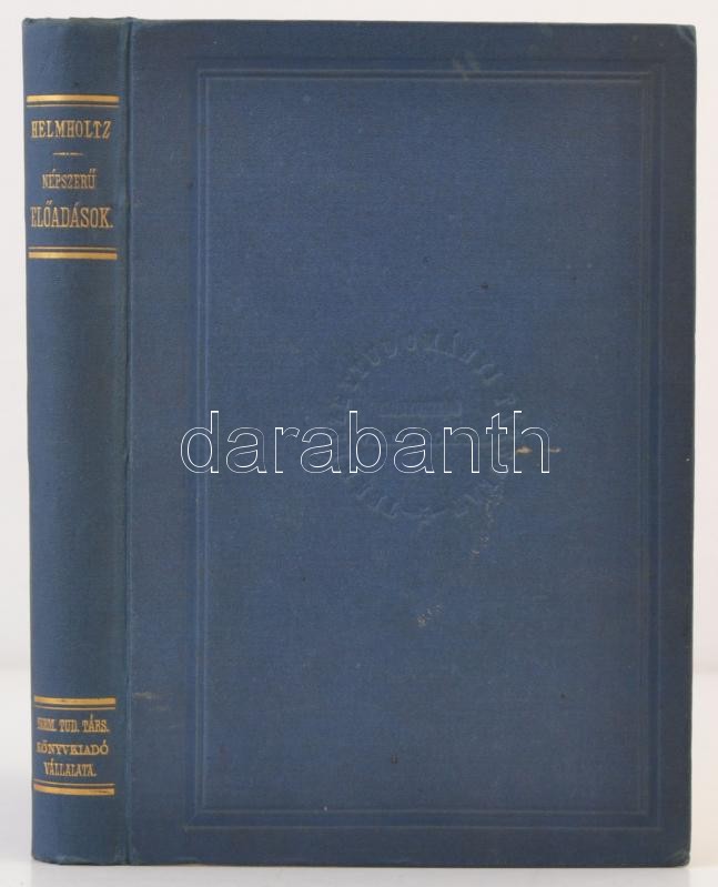 H. Helmholtz: Népszerű tudományos előadások. Fordították B. Eötvös Loránd és Jendrassik Jenő. Bp., 1874, Királyi Magyar Természettudományi Társulat. Kiadói egészvászon-kötés, fametszetű ábrákkal. Jó állapotban.
