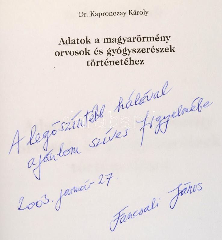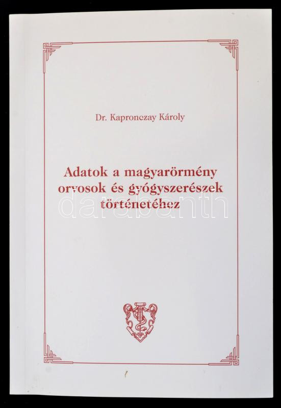 Dr. Kapronczay Károly: Adatok a magyarörmény orvosok és gyógyszerészek történetéhez. Magyar-Örmény Könyvtár 8. Budaörs, 2002, Holló és Társa Bt. Kiadói papírkötésben. Számozott (200/122.) példány. A sorozat szerkesztőjének dedikációjával.