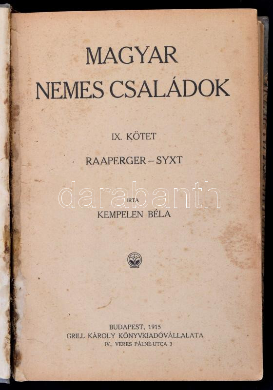 Kempelen Béla: A magyar nemes családok IX. kötet. Bp., 1915, Grill Kár... https://www.darabanth.com/hu/287-Gyorsarveres/287.0/Konyvek/Konyvek-Tortenelem~100031/Kempelen-Bela-A-magyar-nemes-csaladok-IX-kotet-Bp-1915-Grill-Karoly-Konyvkiadovallalata~II1508242