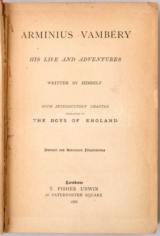 Arminius Vambéry: Aminius Vambéry His Life & Adventues. London, 1886, T. Fisher Unwin, XIX+350+30 p. Kiadói illusztrált, aranyozott egészvászon kötés. Angol nyelven. A gerince és a kötése sérült. A Vámbéry kép elöl a hártyapapír leszakadt. /