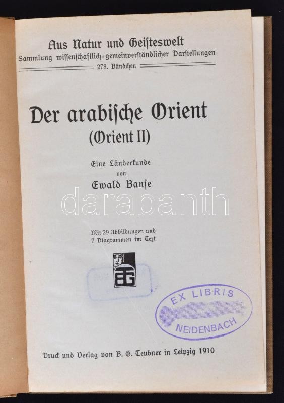 Banse, Ewald: Der arabische Orient (Orient II). Eine Länderkunde. Leipzig, 1910, B. G. Teubner (Aus Natur und Geisteswelt 278.). Díszes vászonkötésben, jó állapotban.