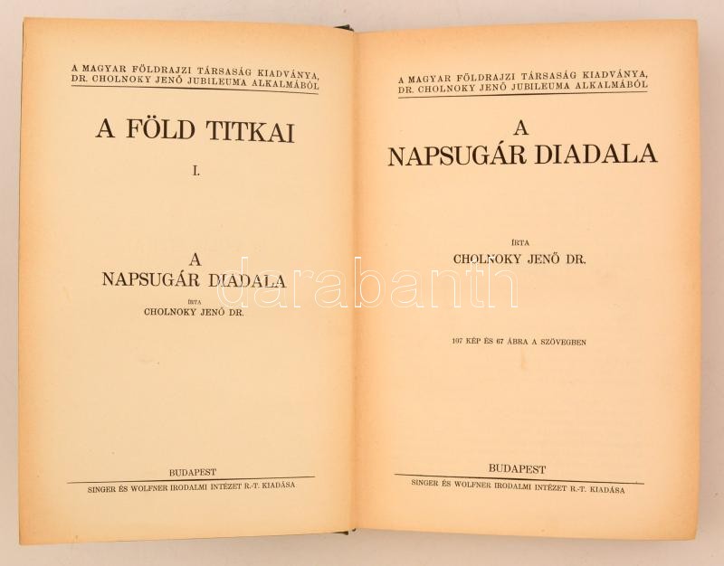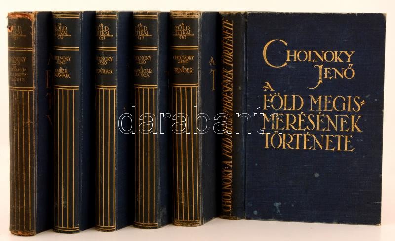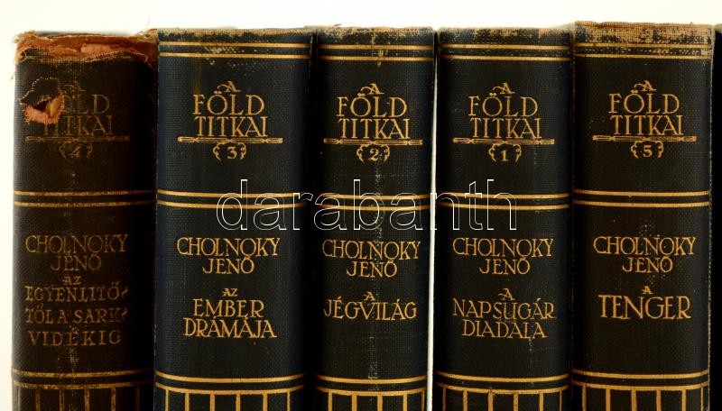 Cholnoky Jenő: A Föld titkai I-V.+A föld megismerésének története. I. A napsugár diadala. 107 kép és 67 ábra a szövegben. 314 p. II. A jégvilág. A sarkkutatások története. Második 1929-ig kiegészített és átdolgozott kiadás. 67 kép és 14 ábra a szövegben. 231 p. III. Az ember drámája. 117 kép és 70 ábra a szövegben. 351 p. IV. Az egyenlítőtől a sarkvidékig. 135 kép és 46 ábra a szövegben. 331 p. V. A tenger. 138 kép és 83 ábra a szövegben. 323 p. + A Föld megismerésének története. 130 kép és 57 ábra a szövegben. 354 p. Budapest, 1930-32, Singer és Wolfner. Kiadói aranyozott egészvászon kötésben. A Föld megismerésének története c. kötetnek a kötése eltér a többitől, nem ennek a kiadásnak a része. A borítók kopottak, a IV. kötet gerince némileg sérült, és az előzéklapjai szakadtak, hiányosak. A kötések egy része laza. Minden kötet fotókkal, ábrákkal térképvázlatokkal gazdagon illusztrálva.