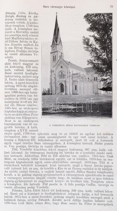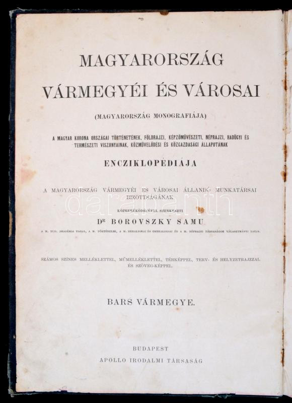Dr. Borovszky Samu (szerk.): Bars Vármegye. Magyarország vármegyéi és városai, Magyarország monográfiája. Több képpel, térképpel és műmelléklettel illusztrálva. Budapest, é.n. [1903], Országos Monográfia Társaság. Kiadói aranyozott, festett, dombornyomott egészvászon kötés, színezett lapszélek, megviselt állapotban, térképmelléklet hiányos.
