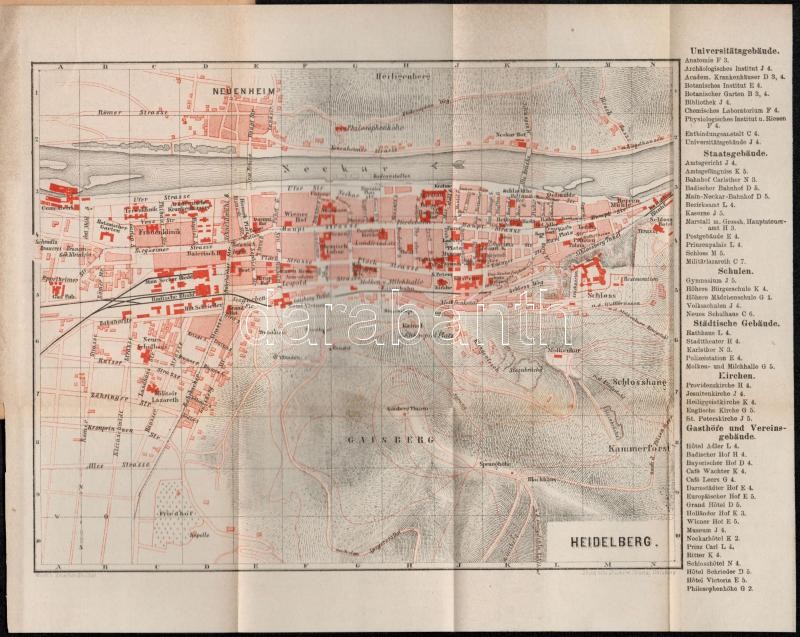 Führer durch die Universitätsstadt Heidelberg und Umgegend. Woerl's Reisehandbücher. Würzburg-Wien, [1886], Leo Woerl. Hatodik kiadás. Kiadói papírkötésben, térképekkel illusztrált, német nyelven. Jó állapotban./