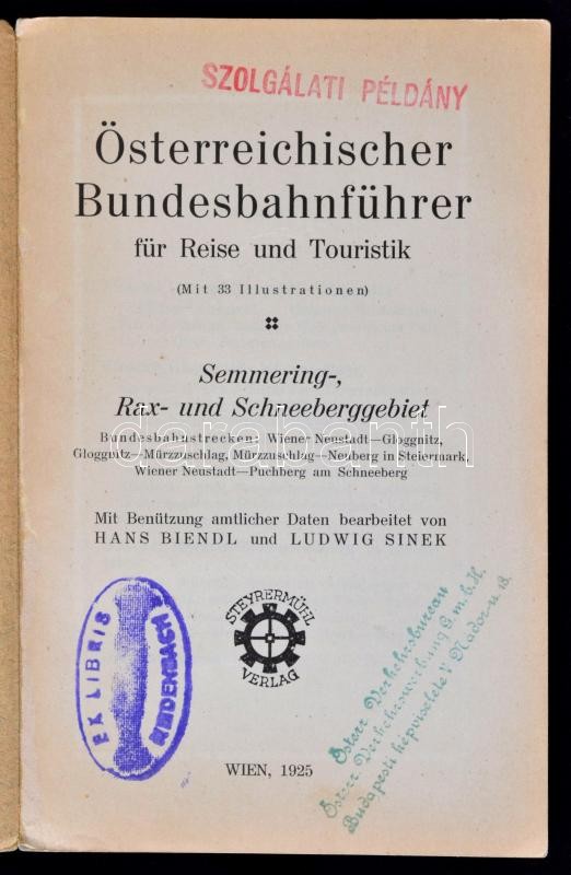 Österreichischer Bundesbahnführer für Reise und Touristik 3.: Semmering-, Rax- und Schneeberggebiet. Szerk.: Biendl, Hans - Sinek, Ludwig. Wien, 1925, Steyrermühl Verlag. Számos fekete-fehér fényképpel. Kopott papírkötésben, egyébként jó állapotban.