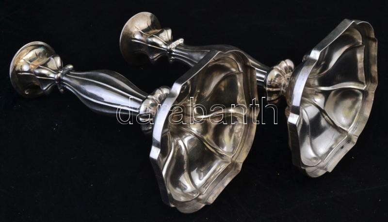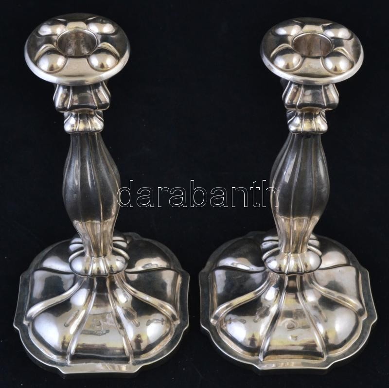Leírás: Antik ezüst (Ag.) gyertyatartó párban ( 2db), jelzett (1857), mesterjeggyel (AK), m:25 és 26 cm, nettó:568 g (párban)