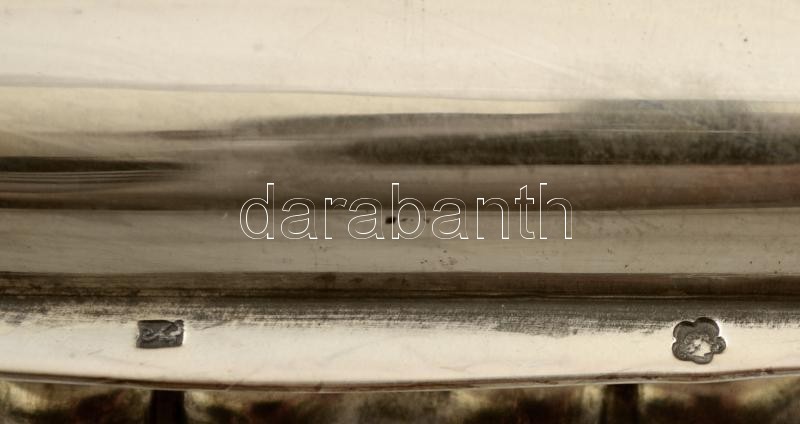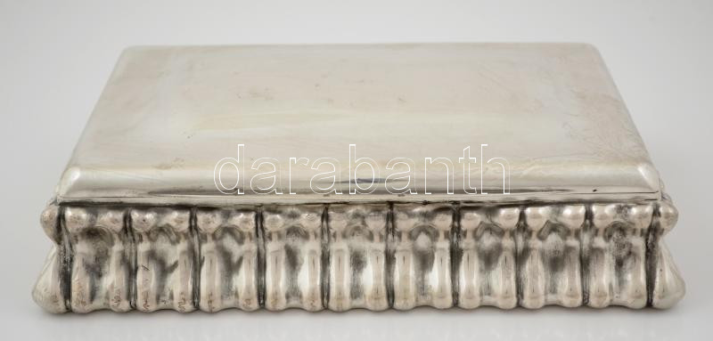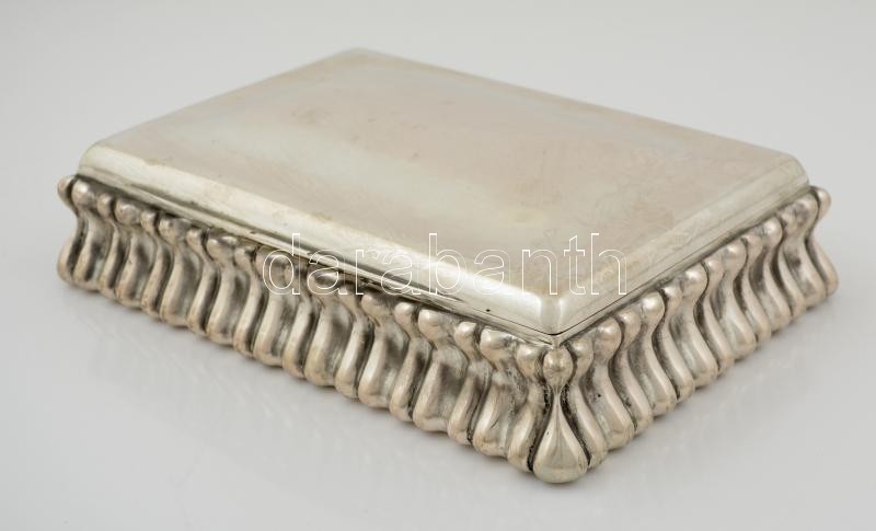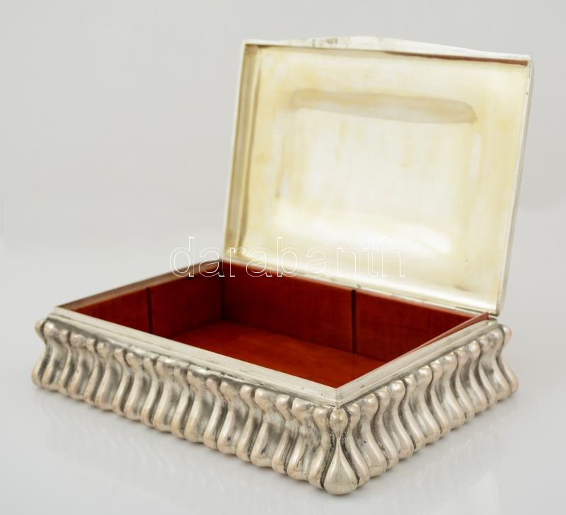 Leírás: Ezüst (Ag.) doboz, mesterjeggyel , jelzett, fa betéttel, 24×17 cm, nettó:764 g