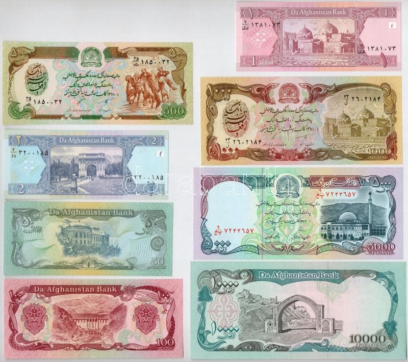 Afghanistan 2002. 1 Afghani + 2 Afghanis + 1979. 50 Afghanis + 1990. 100 Afghanis + 1991. 500 Afghanis + 1000 Afghanis + 1993. 5000 Afghanis + 10.000 Afghanis C:UNC