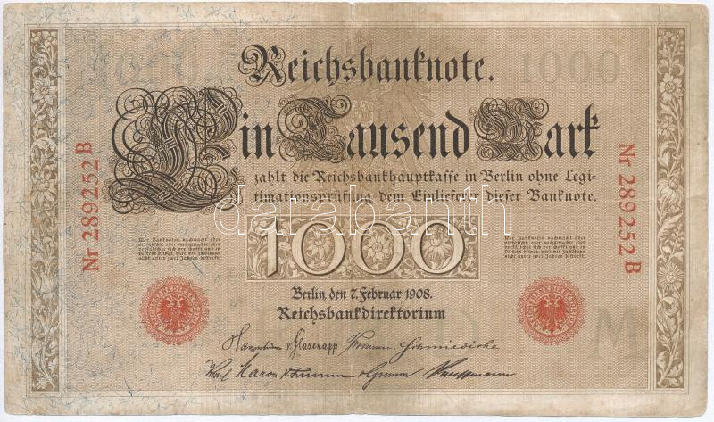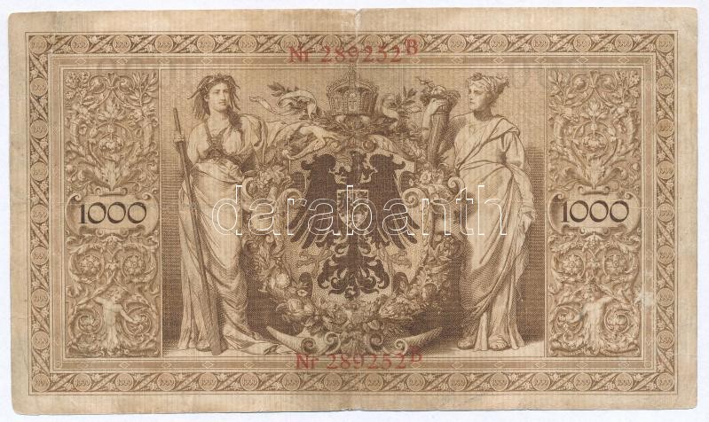German Empire 1908. 1000 M... https://www.darabanth.com/hu/287-Gyorsarveres/287.0/Numizmatika/Kulfoldi-bankjegyek~300013/Nemet-Birodalom-1908-1000M-TIII-szakadas--German-Empire-1908-1000-Mark-CF-tear--Krause-36~II1510279